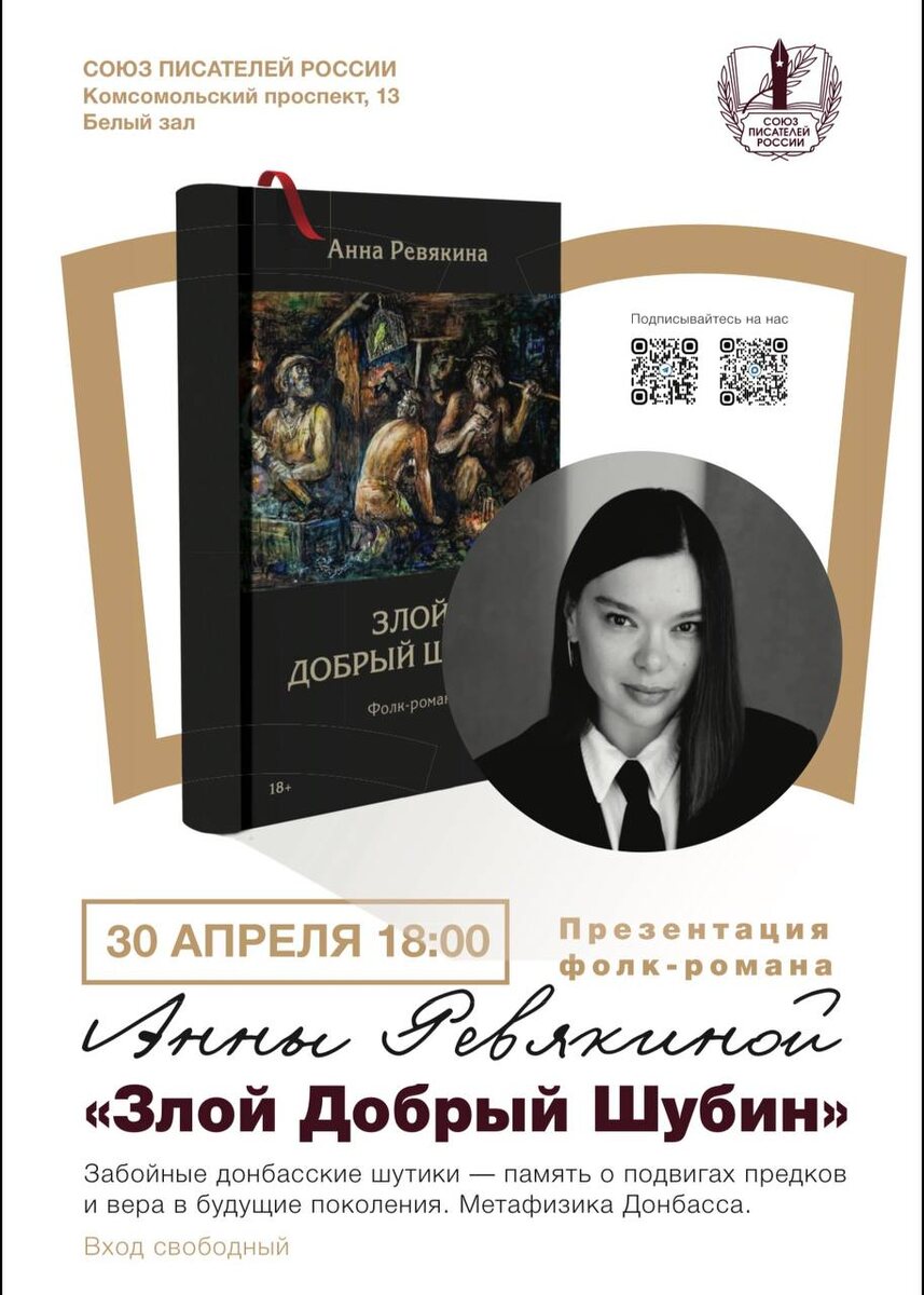 30 апреля на Комсомольском, 13 пройдёт презентация фолк-романа писателя, члена СПР Анны Ревякиной «Злой Добрый Шубин».