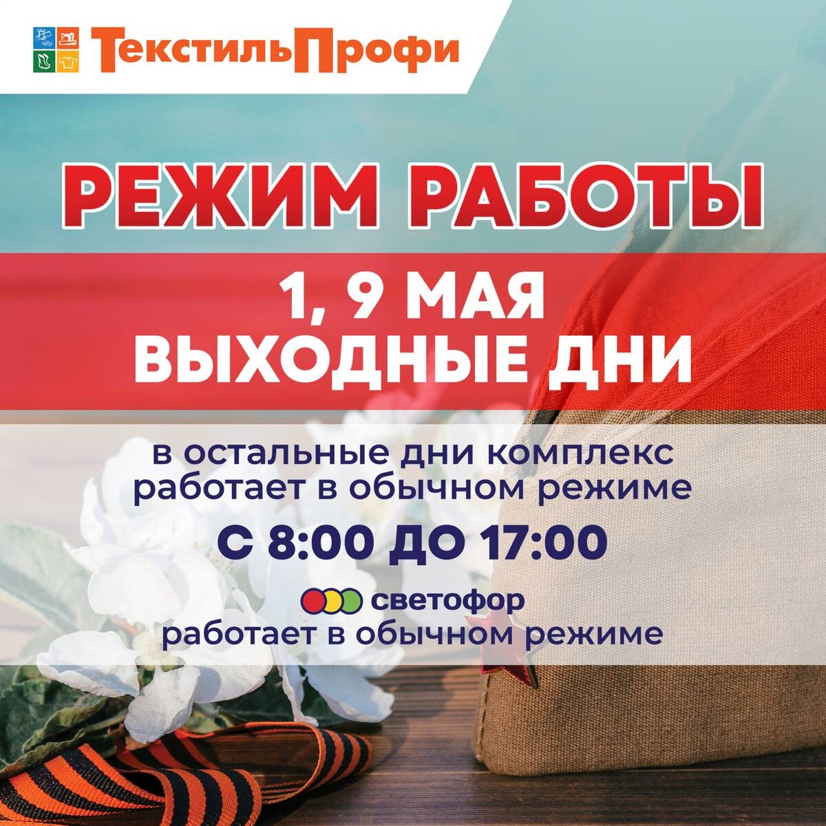 Уважаемые покупатели! Обращаем ваше внимание на график работы комплекса в праздничные дни❗ ✅ 1, 9 мая - выходные дни В остальные дни ждем вас в ТекстильПрофи-Иваново ежедневно с 8:00 до 17:00 🙌🏻 🚦 Магазин "Светофор" (корпус В) работает в обычном режиме - с 9:00 до 20:00 ежедневно.