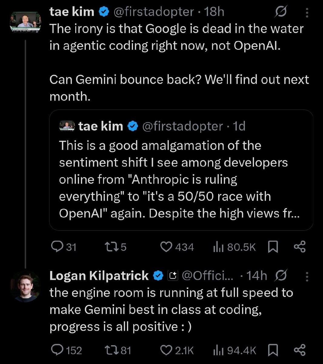 Логан Килпатрик подтвердил, что команда Gemini сейчас жмёт максимум, чтобы сделать модель сильнее в кодинге. Цель простая — догнать и обогнать конкурентов в агентной разработке, где сейчас громче всех звучат Claude Code и Codex. 😤 Если Google реально докрутит кодинг, гонка AI-дев инструментов станет ещё жёстче. 😎 КиберПоток / Навигация #новость #google #ai #claude #КП