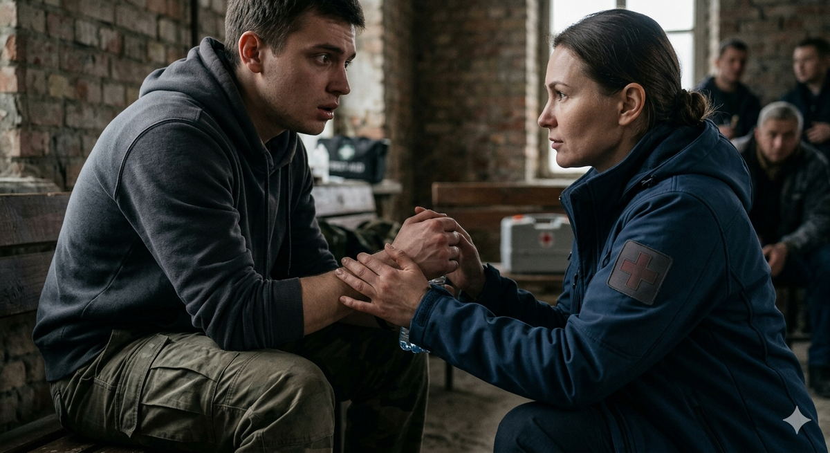 В тактической медицине мы знаем цену каждой секунде: жгут, бандаж, эвакуация. Но что делать, если ваш товарищ, боец или просто человек рядом не ранен физически, но полностью «выключен»? Он смотрит в одну точку, не реагирует на команды, застыл в ступоре или, наоборот, мечется в панике, мешая окружающим и подвергая себя опасности. Это — острая реакция на стресс (ОРС). В этот момент его мозг перегружен. Психологическая помощь в этой ситуации — не роскошь, а критическая необходимость для выживания. ОРС — это не трусость, это сбой в работе мозга под давлением запредельных нагрузок. Главная задача — вернуть человека в реальность и «включить» его логическое мышление. Это и есть психологическая реанимация. Чего делать НЕЛЬЗЯ никогда: Действуйте четко, уверенно и спокойно. Ваша уверенность — его якорь. 1. Установите контакт: 2. Верните в реальность (Техника «Заземления»):