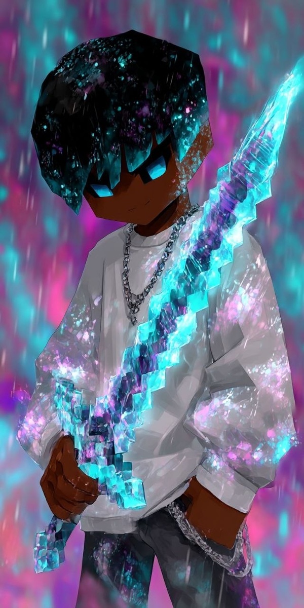 body savis from the very milo, with dark skin and short hair covering his eyes, laughing while engulfed in moonlight, drawn in the style of manga, holds a diamond sword. it should have bold outlines and vibrant colors to make him stand out against a rainy forest background. no text in the picture, high resolution try to make it less minecraft as posible --chaos 30 --ar 1:2 --profile ix84zud --stylize 300 --draft #Нейросолнце@neo_neurosun