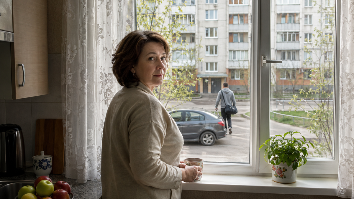 Дверь закрылась мягко. Вера подошла к окну, отвела занавеску. Серый седан стоял на своём месте, у клумбы с упрямыми бархатцами. Во дворе ничего не изменилось. Та же сырость, тот же ранний свет, те же следы колёс на асфальте. Но теперь она не вглядывалась в машину как в улику. Просто смотрела, как сын выходит из подъезда с белым пакетом и тёмной сумкой, пересекает двор и исчезает в арке.