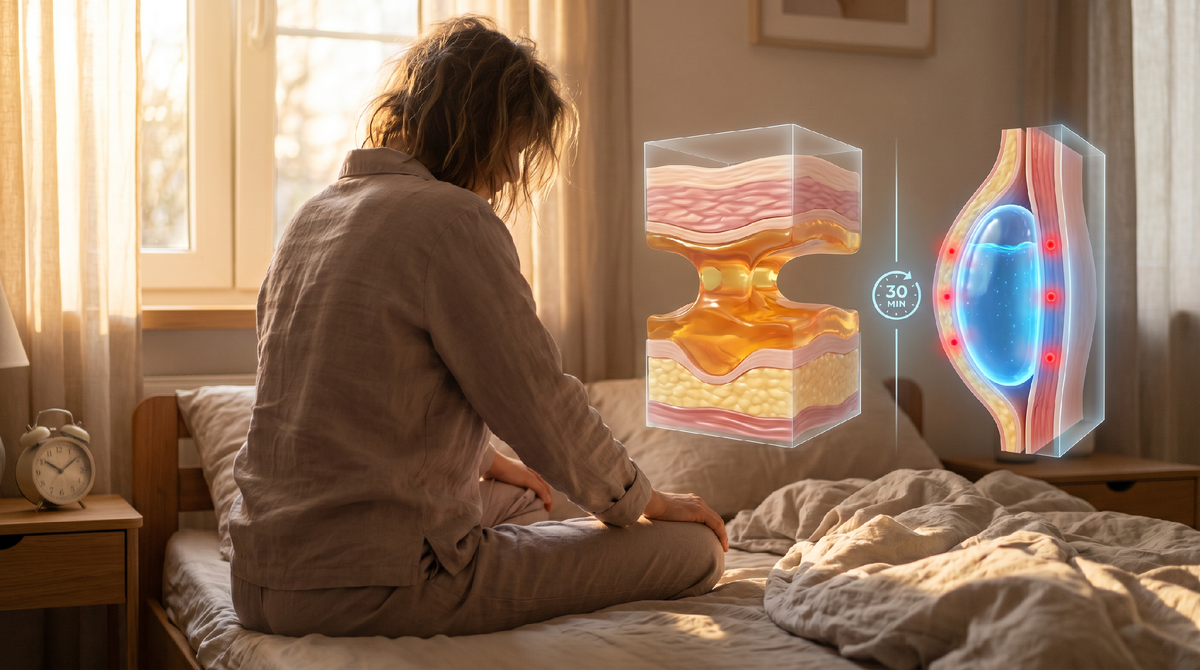 Горячий душ сразу после подъёма - тепло физически снижает вязкость ткани. Слои начинают скользить раньше.