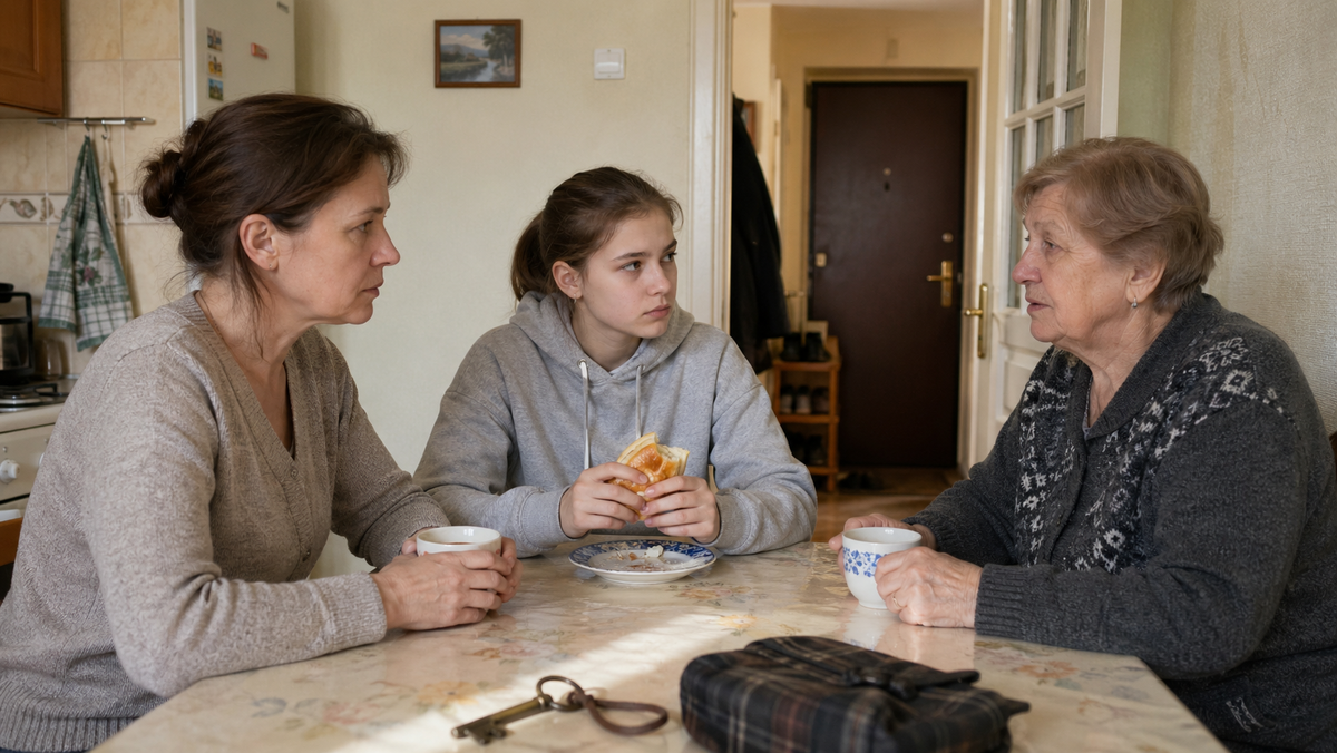На кухне Соня шуршала пакетом с пирожком. Галина Петровна снимала пальто, тяжело опираясь рукой о стену. От неё снова тянуло улицей, мятой и сырой шерстью. Из духовки пахло вчерашним хлебом, который Ирина машинально включила подогреться, когда вернулась. Дом был тем же самым. Стол тот же. Чашки те же. Даже крошки на клеёнке, кажется, лежали точно там же, где утром.