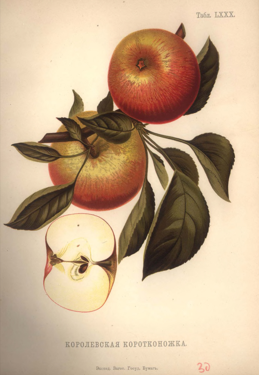 Ботаническое описание плода * Форма и величина: Яблоко среднего размера, выделяется характерной, сильно приплюснутой, ровной округлой формой. * Плодоножка: Весьма короткая (всего 6–10 мм) и толстая, что и дало название всему сорту. * Кожица: С матовым блеском, изначально светло-зеленая, при созревании становится золотисто-желтой. Солнечная сторона покрыта нарядным мраморно-карминным румянцем с темно-вишневыми полосками. Часто бывает шероховатой от легкой ржавчины и покрыта крапинками. * Мякоть: Желтовато-белая, плотная. При созревании становится мягкой, нежной и сочной. Вкус отличный, винно-сладкий (ренетный) с легким характерным ароматом аниса.