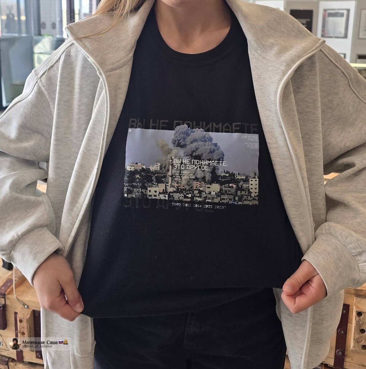 Для поездки в Поныри надела актуальную футболку от бренда «Колос». В центре — фотография Сектора Газа после удара Израиля.