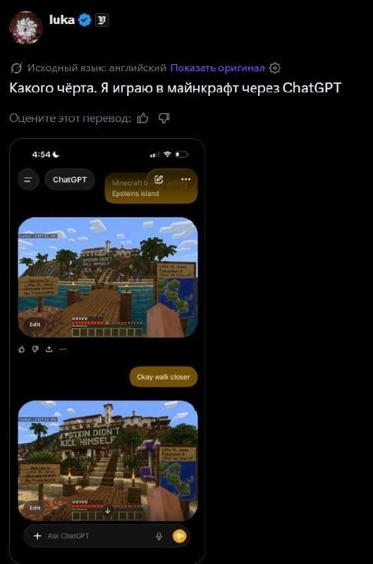 Чувак играет в Minecraft прямо в ChatGPT гений расписывает нейронке свои действия, а она генерирует изображения из игры. Ждём прохождение Dark Souls на ChatGPT. CtrlAltDelights- подписаться