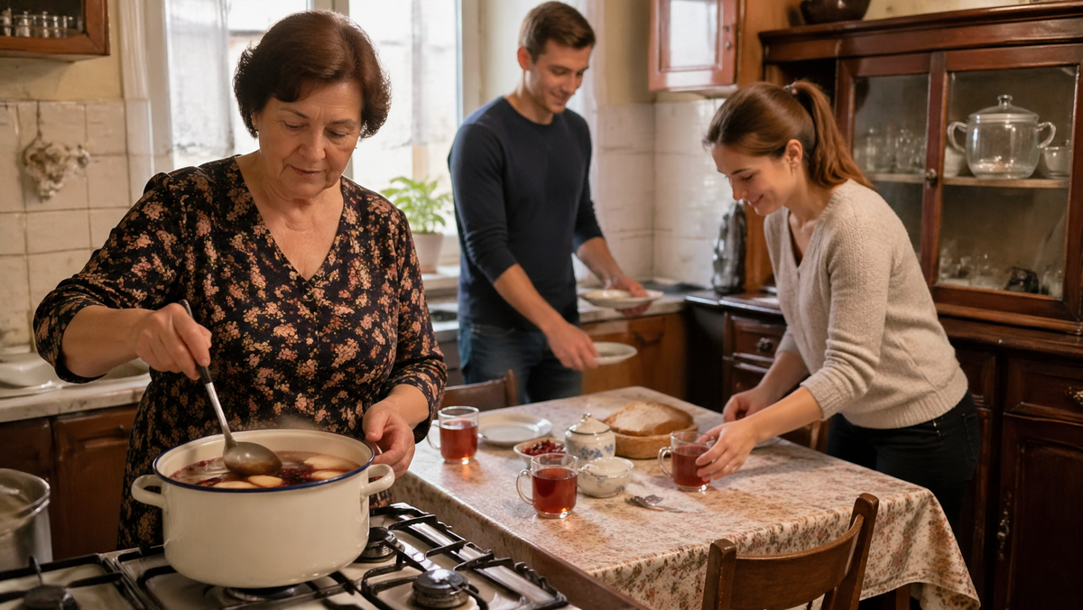 В тот день компот был из яблок и чёрной смородины. Пар поднимался к шкафчикам, ложка звенела о стекло, подоконник стал влажным. Вера мыла доску после нарезки овощей, Денис искал в ящике открывалку, а Галина, как всегда, стояла у плиты прямо, чуть подавшись вперёд, словно охраняла не кастрюлю, а порядок вещей.