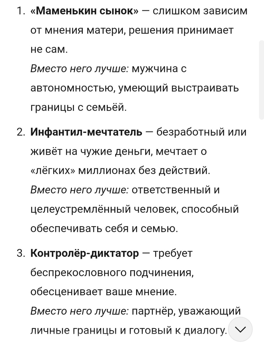 Вибратор, по мнению автора - будет лучше "маменькиного сынка". Вообще, маменькин сынок это почти мифический персонаж, в природе встречающийся крайне редко, поэтому вероятность наткнуться на такого мужчину у любой женщины - минимальная. Однако, если в маменькины сынки записывать всех, кто любит и уважает своих родителей, то это наоборот, почти все мужчины. Авторы различных книг и курсов стараются расширить такие понятия, чтобы в итоге целевая покупательница получила психологическое поглаживание "это не ты виновата, это всё он". И это скрытый посыл данного пункта. Он - маменькин сынок. Или один из следующих десяти типов.