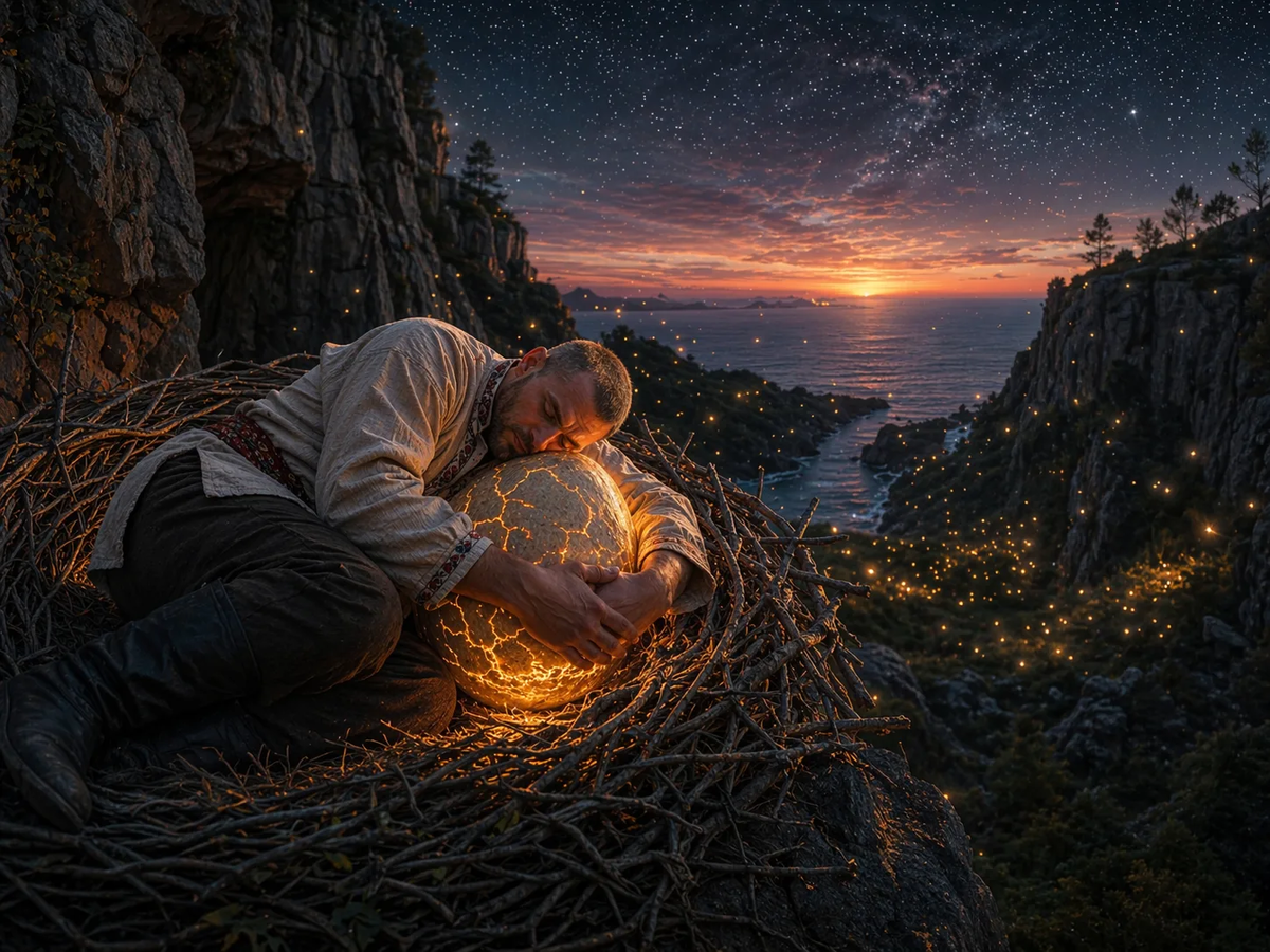 Дмитрий лёг прямо в гнездо, свернулся калачиком вокруг яйца, обхватил его руками и прижался щекой: — Ничего, маленький, ничего. Я здесь, я тебя не брошу. Знаешь, я тоже... без родителей рос. Они ушли… не по своей воле. А я злился, думал, бросили. А они не бросали - их убили.