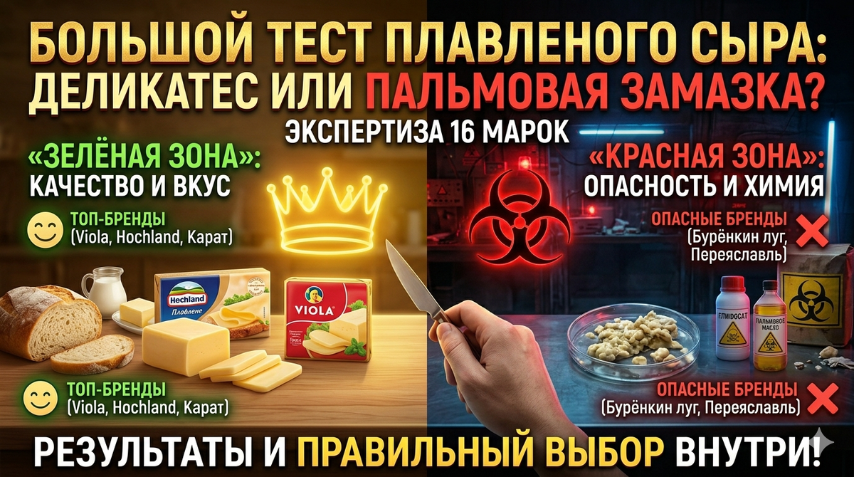 В эфире «Лаборатория на тарелке». Мы уже выяснили, кто подмешивает строительный гипс в пшеничную муку, и нашли агрохимикаты в популярной гречневой крупе. Сегодня на нашем лабораторном столе — фольга и пластиковые ванночки. Мы вскрыли 16 марок плавленого сыра, чтобы выяснить: кто кормит нас техническим пальмовым маслом, зачем производители накачивают продукт опасными фосфатами и в каких пачках сыра нет вообще.