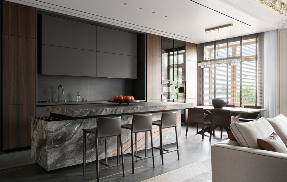 Стена-скала, стеклянная гардеробная и мраморный остров: квартира 169 м² с элементами классики