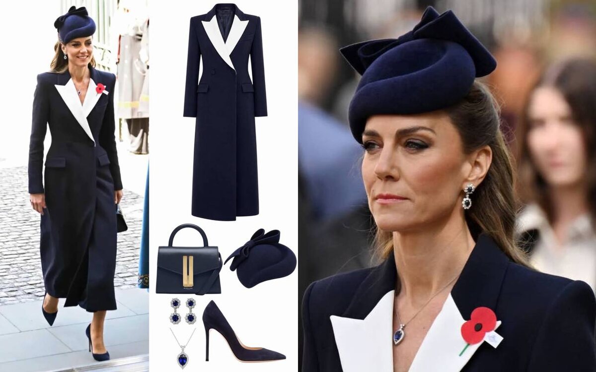 25 апреля 2026 года Кэтрин, принцесса Уэльская, появилась у мемориала Кенотаф на Уайтхолле в одиночестве: Уильям не сопровождал её. Она возложила венок от имени короля Карла, подписав карточку от обоих. День ANZAC в 2026 году отмечал 111-ю годовщину высадки в Галлиполи, и принцесса вышла к мемориалу с образом, в котором не было ни одной случайной детали. Пальто от Alexander McQueen, созданное Сарой Бёртон специально для принцессы, задаёт тон всему ансамблю. Двубортный силуэт с чётко очерченной талией и подчёркнутые контрастные лацканы. Шляпа от Jane Taylor, интерпретация модели Selene с добавленным бантом, посажена на лоб и слегка опускает поля, обрамляя лицо: эффект лаконичный, почти геометрический. Насыщенная замша Gianvito Rossi и компактный DeMellier Nano Montreal в том же темно-синем замыкают монохромный ансамбль без единой лишней ноты. Украшения прочитываются отдельным текстом. Серьги с сапфирами и бриллиантами в двойной оправе принадлежали принцессе Диане, которая носила их на