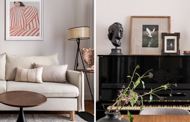 Черное пианино в гостиной стало отправной точкой для всей цветовой схемы — именно оно ввело черный как акцентный цвет в нейтральный интерьер. Дизайнеры нашли его в квартире и решили оставить. Вокруг пианино выстроена вся стена: скульптура сверху, картины рядом и освещение над ним.