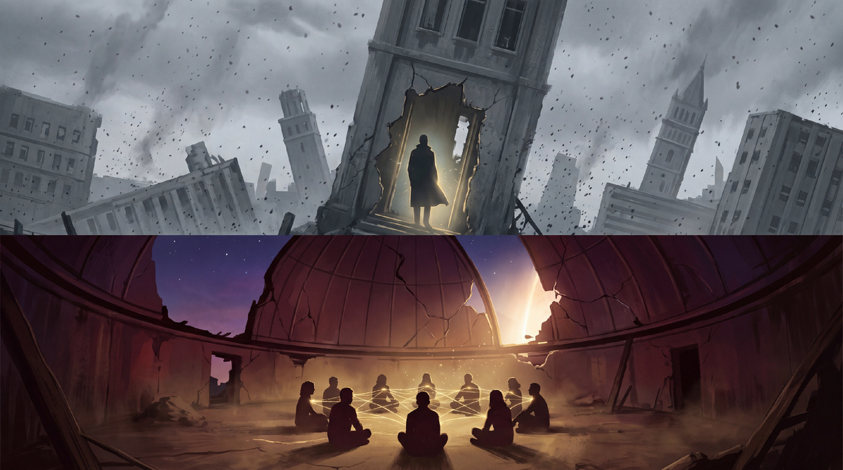 Ари кивнул и направился к выходу. Давид и Мириам двинулись за ним. У пролома он обернулся, бросил взгляд на оставшихся. Семь человек сидели в круге, и над ними колыхался золотистый купол света — словно невидимая плёнка, отделяющая их от умирающего мира.