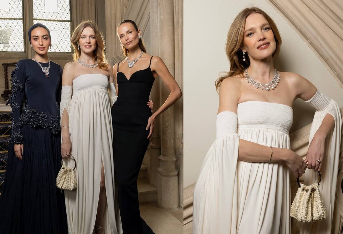 22 апреля аббатство Во-де-Серне, цистерцианская постройка XII века на краю Рамбуйенского леса, принимало гостей Chaumet. Дом представил новую коллекцию высокого ювелирного искусства Journey Through Nature: зелёный чай, шафран, ваниль и оранжереи императрицы Жозефины, где та собирала растения со всего света. За ужин отвечал мешленовский шеф Фредерик Антон, между подачами танцевали артисты балета, а меццо-сопрано Аксель Сен-Сирель, певшая гимн с крыши Гран-Пале на открытии Олимпиады 2024, давала живой концерт. Наталья Водянова выбрала белое платье в пол от Coperni. Свободный силуэт с завышенной талией в духе ампира, драпированная юбка, расходящаяся от линии декольте: минимум конструкции, максимум воздуха. Образ дополнили жемчужное колье Chaumet и небольшая сумочка расшитая бисером с ручкой в виде металлического кольца. Сдержанность и нежность в одном образе. Белый в ювелирном контексте требует смелости. Он конкурирует с украшениями, не прощает случайных решений и требует идеально по