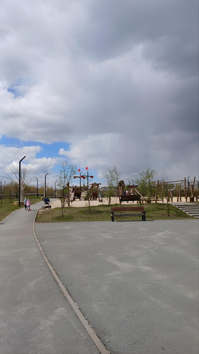 Ходили гулять. Погода в Челябинске не очень: ветер буквально сбивал с ног, по небу стремительно неслись тёмные облака, а время от времени начинал накрапывать дождь. Но это не повод сидеть дома — мы с детьми всё равно отправились на одну из наших любимых площадок!