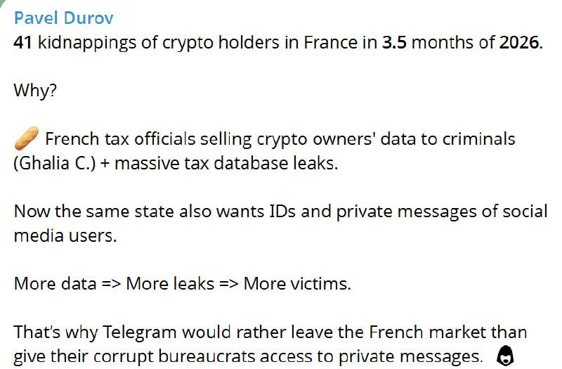 С начала 2026 года во Франции похитили 41 владельца криптовалюты за 3,5 месяца, то есть похищения случались каждые 2-3 дня. Преступники не взламывают кошельки, не воруют пароли, а просто приходят домой с оружием и требуют перевести деньги прямо сейчас. 🔸В одном из последних случаев в Бургундии похитили жену и 11-летнего ребёнка криптопредпринимателя — требовали €400 тысяч выкупа. Следствие зафиксировало характерную деталь: похитители знали точный размер портфеля жертвы. ❓Но откуда? Главная версия — утечка из государственных баз данных. Бывшая сотрудница французской налоговой Галия С. уже осуждена за передачу данных криптовладельцев из фискального реестра лицам, связанным с организованной преступностью. На неё вышли, когда следствие отработало цепочку от конкретных ограблений к источнику «наводки». 🖍Основатель Telegram Павел Дуров прямо связывает утечку налоговых данных Франции со списком целей для преступников, который и привел к резкому росту похищений. Он добавил, что тот же францу