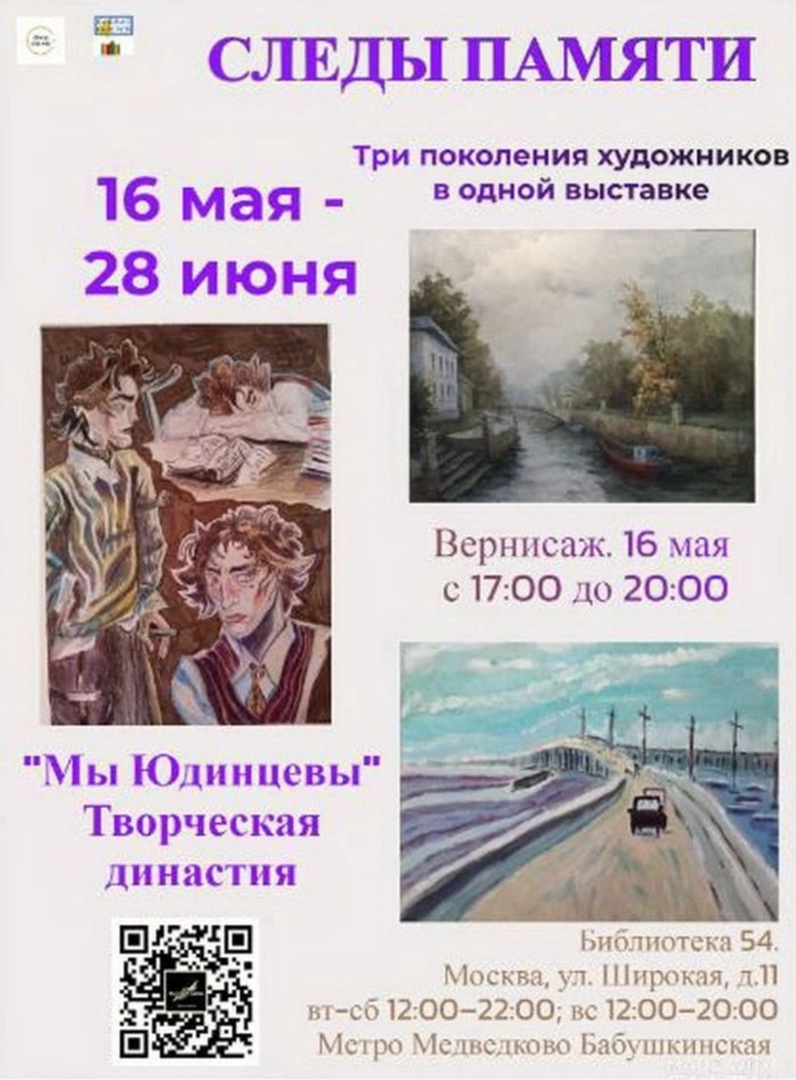 ДРУЗЬЯ, анонсирую, что очень скоро после майских праздников пойдет наша очередная семейная выставка династии Юдинцевых. ПРЕСС-РЕЛИЗ «Следы памяти»: в библиотеке №54 представят работы трёх поколений династии Юдинцевых Дата проведения: 16 мая – 28 июня 2026 года Место: г. Москва, библиотека №54, ул. Широкая, д. 11 (м. Медведково) С 16 мая по 28 июня 2026 года в московской библиотеке №54 пройдёт семейная выставка «Следы памяти», объединяющая живопись и графику трёх представителей династии Юдинцевых. Зрители увидят порядка 23 произведений, созданных в разные годы и в разных манерах – от классического пейзажа до современных аниме-влияний. В экспозиции представлены: · Наталья Юдинцева (1977 г.р.) – 18 живописных работ. Это яркие, непохожие друг на друга пейзажи из нескольких серий: виды парка «Царицыно», мотивы заходящего солнца, «питерская» серия, пейзажи с элементами абстракции, пейзажи-метаморфозы и метафизические композиции. Особое место занимает натюрморт «Пробуждение весны» (2022