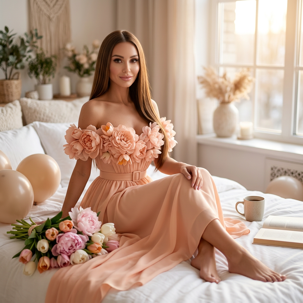 Промпт: Профессиональная фотосессия девушки, строгое сохранение черт лица и пропорций. Локация: светлая эстетичная квартира, большие окна, уютная кровать с белоснежным бельем.