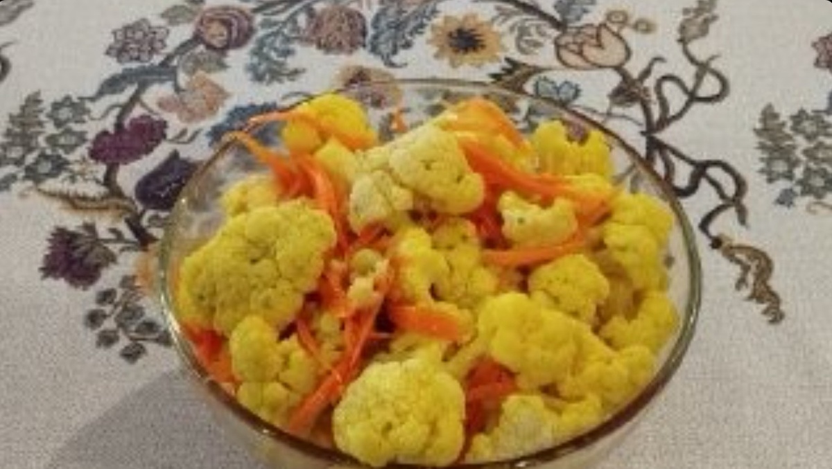 Салат из цветной капусты и корейской моркови — это пикантная, хрустящая закуска с ярким вкусом. Его можно подавать как самостоятельное блюдо, как гарнир к мясу или рыбе, а также добавлять к рису или картофелю. ### Ингредиенты: - Цветная капуста — 350 г - Морковь по-корейски — 500 г - Чеснок — 4 зубчика - Растительное масло — 50 мл - Кинза (кориандр) — 40 г - Уксус 9% — 1 ст. л. - Перец чили — по вкусу - Соль — по вкусу ### Приготовление: 1. Разберите цветную капусту на мелкие соцветия и отварите в кипящей воде до мягкости (примерно 3–5 минут). Затем откиньте на дуршлаг. 2. В большую миску выложите морковь по-корейски и добавьте цветную капусту. 3. Посыпьте сверху молотым перцем чили и пропустите через пресс чеснок. 4. Разогрейте растительное масло и вылейте на чеснок и перец. 5. Мелко нарежьте кинзу и добавьте в салат. 6. Влейте уксус по вкусу. 7. При необходимости посолите и тщательно перемешайте. Салат готов к подаче сразу после приготовления.