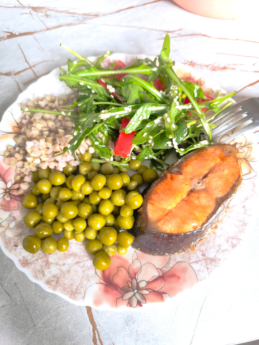 Горошек зеленый , гречка зеленая , форель жареная , салат из руколы , огурца, помидора, кунжута, заправка сок лимона +кунжутное масло.