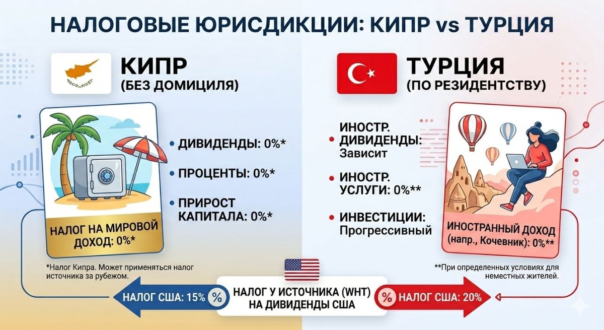 Многие сейчас рассматривают эти две юрисдикции как удобные точки для жизни и ведения дел. Вокруг них много шума про «нулевые налоги», но в реальности все немного сложнее. Давайте разберем основные информационные блоки, не вдаваясь в схемы оптимизации, а просто фиксируя юридические факты. 🇨🇾 Кипр: Статус Non-Domicile (Non-Dom) Кипр предлагает законодательно закрепленный льготный режим для иностранцев. Суть: Если вы налоговый резидент Кипра, но не его «домициль» (упрощенно: не родились там и не прожили 17 лет), вы освобождаетесь от SCD (Special Contribution for Defence). Результат: Налог Кипра на дивиденды, проценты по вкладам и доходы от продажи ценных бумаг (акций, облигаций) по всему миру составляет 0%. Срок: Статус действует 17 лет с момента получения. Нюанс с США: Если вы владеете акциями США, Америка удержит налог у источника. По соглашению (DTA), для резидентов Кипра это обычно 15%. Кипр сверху ничего не возьмет, но американские 15% у вас заберут при выплате. 🇹🇷