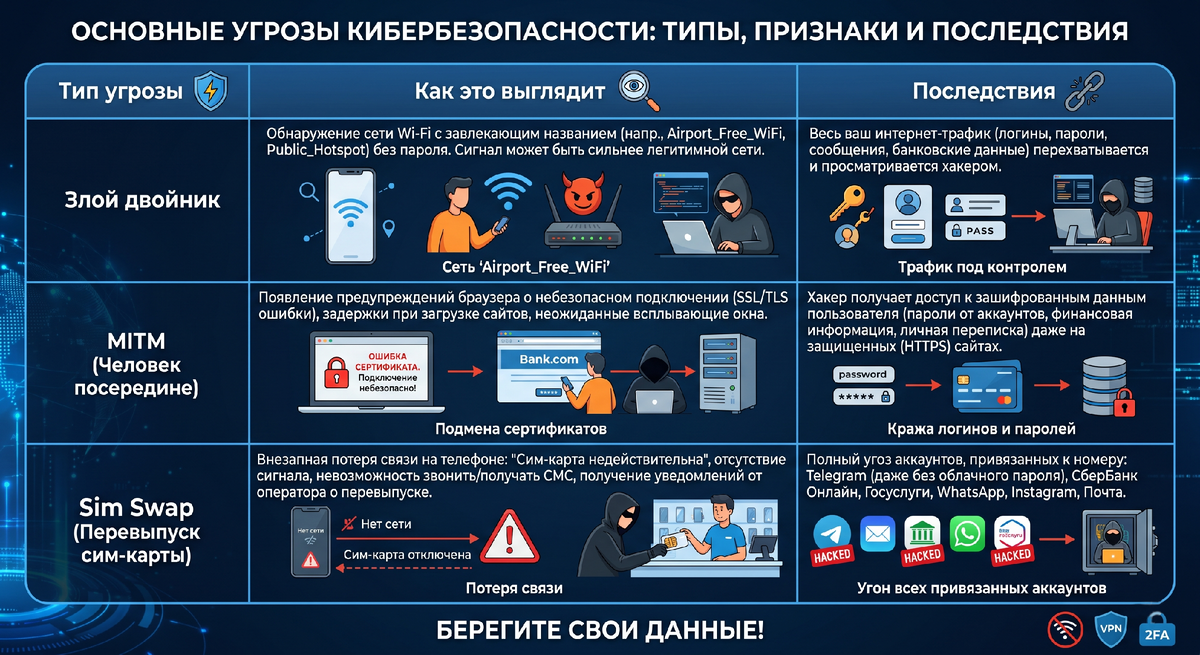 Тип угрозыКак это выглядитПоследствияЗлой двойникСеть с названием Airport_Free_WiFiВесь ваш трафик проходит через устройство хакера.MITM (Человек посередине)Подмена сертификатовХакер может видеть ваши логины и пароли даже в зашифрованных приложениях.Sim SwapПеревыпуск сим-картыУгон всех аккаунтов, привязанных к номеру (включая Telegram без облачного пароля).
