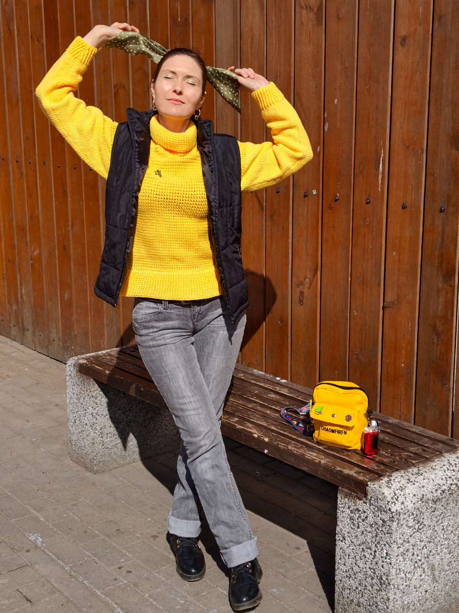 А вот и долгожданный свитерочек!!! 🥳🥳🥳 Простой, базовый, повседневный ☺Впервые выгуляла и отфоткала 🥰 Наконец-то могу носить жилетки 😊 Сделала у свитера рукава плотнее, чтоб руки не мерзли в жилетке 😁 При этом, тушка свободно вентилируется, чтоб не задохнуться в помещении 😌 Ворот сделала половинчатый, чтоб не как удавка 🤭 Пряжа - молочный акрил (его реально делают из молока О.О ), крючок 4,5мм на тушку и 3мм на рукава, манжеты, ворот, низ. Всем хорошего весеннего настроения ;)