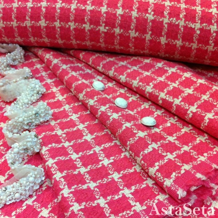 Почему одна ткань способна сделать образ статусным без единого аксессуара? Всё дело в букле. Есть вещи, которые не просто актуальны — они вне времени. Итальянский шерстяной твид в розовом цвете с крупной белой клеткой — именно такой материал. Лёгкая зернистость поверхности, насыщенный цвет, выразительный рисунок — и мгновенная ассоциация с легендарной эстетикой Chanel. Узнаваемой, женственной, уверенной. Розовый и белый в клетку — сочетание, которое выглядит одновременно свежо и благородно. Рисунок добавляет ритм, не перегружая. Фактура букле придаёт глубину — это не просто цветное полотно, а материал с визуальным объёмом. Состав 100% шерсть, ширина 150 см — всё для того, чтобы кроить без компромиссов. Ткань тонкая и пластичная, держит форму, но не утяжеляет силуэт. Идеальный баланс для демисезонных вещей. Костюм в стиле Chanel. Жакет с окантовкой и юбка-миди — классический дуэт, который работает десятилетиями. Розовый оттенок делает образ современным и лёгким, не теряя в элегантности.