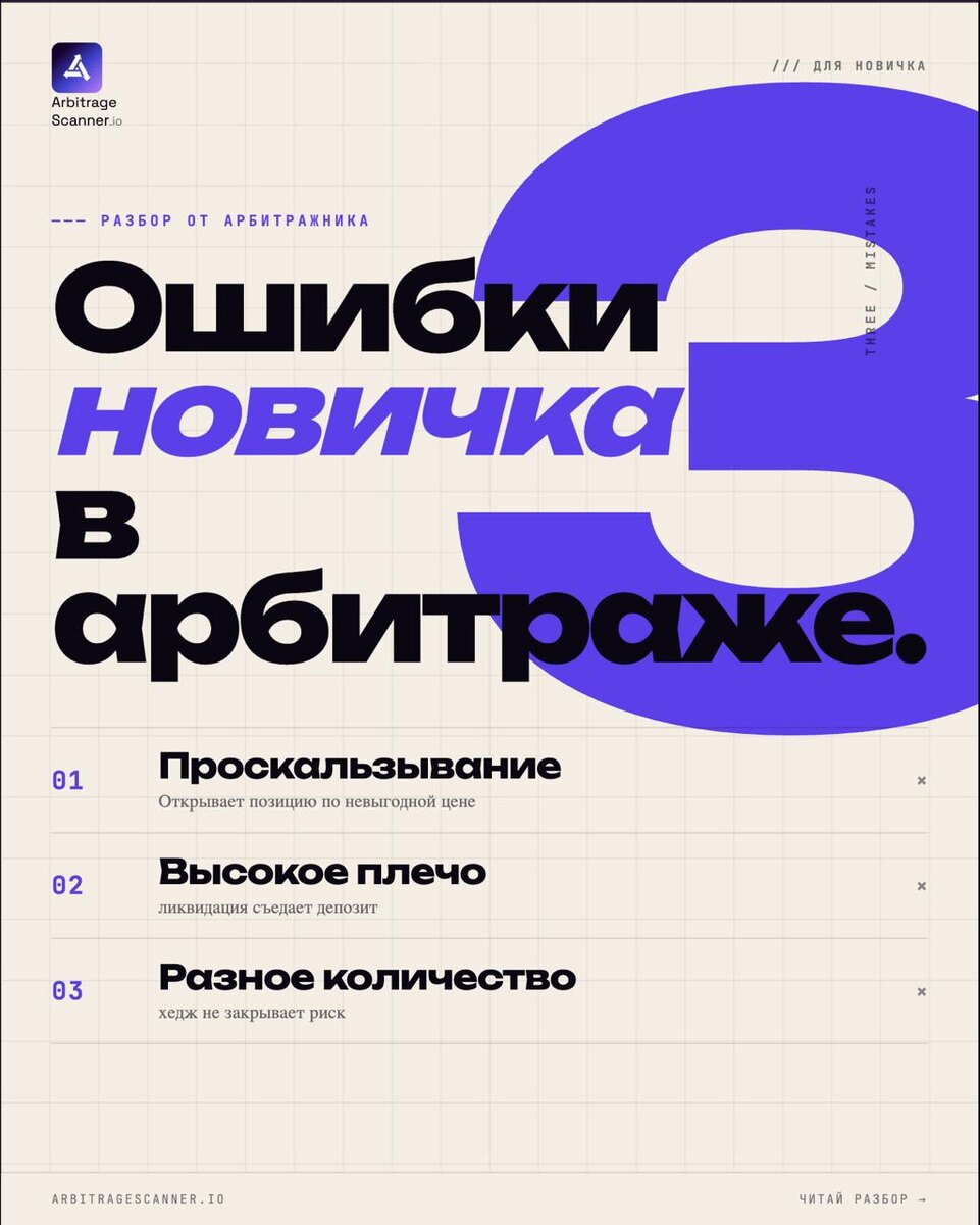 Арбитраж выглядит просто — купил дешевле, продал дороже. Но дьявол в деталях. Вот три ошибки которые совершают почти все в начале: ❌ Ошибка 1 — Проскальзывание Видишь спред 1.5% — входишь — а по факту берёшь 0.3%. Потому что стакан был не плотный и цена сдвинулась пока ты исполнял ордер. Всегда проверяй глубину стакана перед входом. ❌ Ошибка 2 — Высокие кредитные плечи Плечо в арбитраже — не для большего заработка, а для хеджирования позиций друг другом. Новички берут х20 думая что увеличивают профит — и получают ликвидацию при малейшем движении цены. ❌ Ошибка 3 — Неравное количество монет Открыл лонг на 100 монет и шорт на 80. Думаешь что захеджировался — а на деле у тебя открытая позиция на 20 монет. Каждая из этих ошибок может превратить прибыльную связку в убыток даже если спред был реальным.