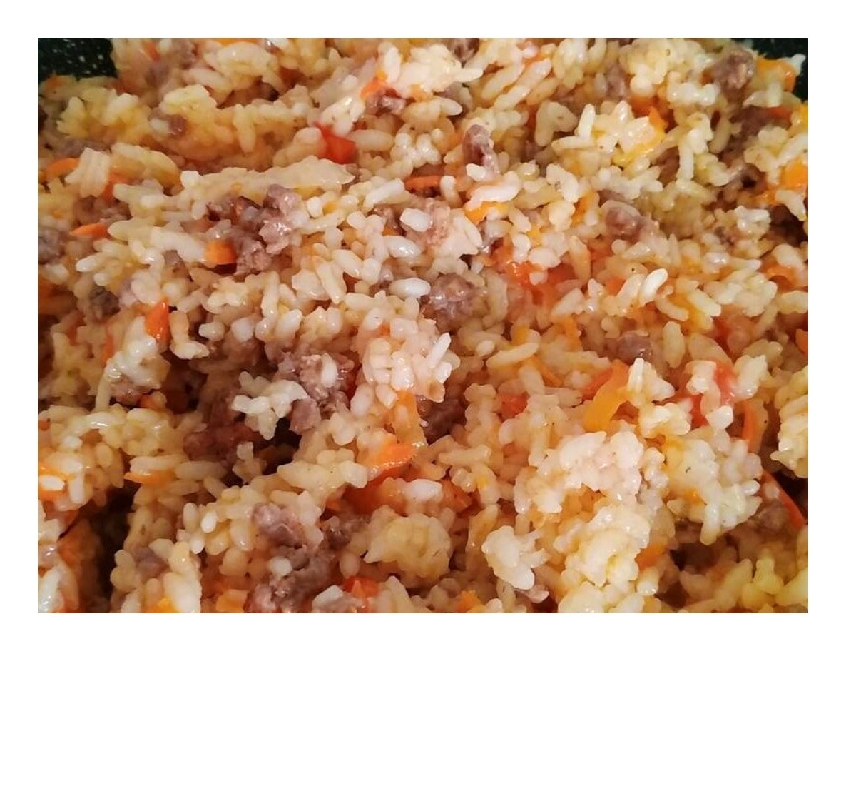 5. Добавляем на сковороду рис и всё тщательно перемешиваем.