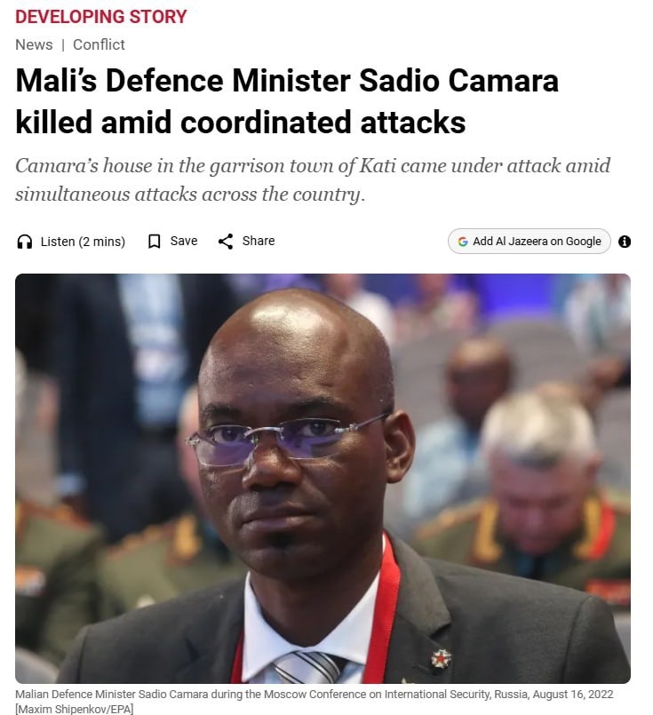 Во время вчерашней скоординированной атаки боевиков в пригороде Бамако под удар попала резиденция министра обороны страны — Садио Камары. Нападение было осуществлено смертником на заминированном грузовике. 🔸Западные СМИ тиражируют новости о гибели малийского чиновника, что на данный момент официально не подтверждено. К примеру, агентство AFP сообщает, что министр доставлен в госпиталь, который усиленно патрулируется военными. С другой стороны, его окружение отрицает даже факт ранения. 📌 Камара стал приоритетной целью для боевиков не только из-за статуса, но и из-за приписываемых ему западными медиа тесных связей с российскими силовыми структурами. Считается, что именно он был ключевым инициатором «приглашения» в страну ЧВК «Вагнер», а затем и Африканского Корпуса МО РФ. ❗️ Как бы то ни было, со вчерашнего дня генерала в публичном поле не видели. Это наводит на подозрения, что в любом случае может встать вопрос о его замене. Однако у малийской верхушки не так много вариантов: в текущи