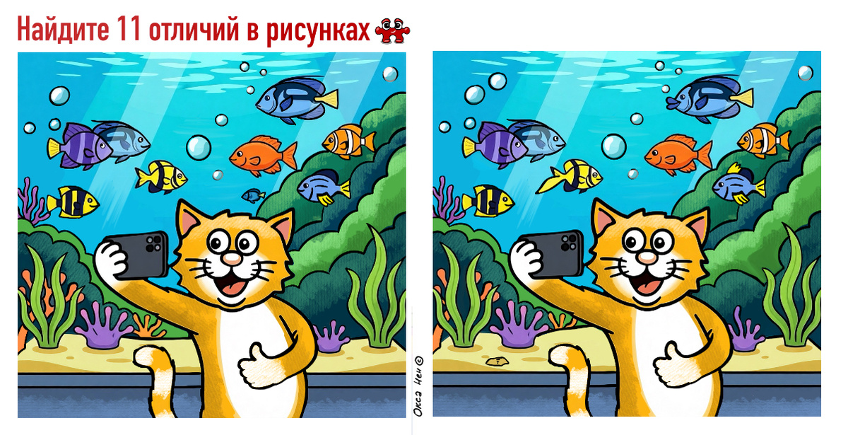 Всем привет! Сегодня наш рыжик отправился на прогулку в океанариум. Пока Кеша считает рыбок в большом аквариуме, можно поискать отличия. Удачи и хорошего настроения!
