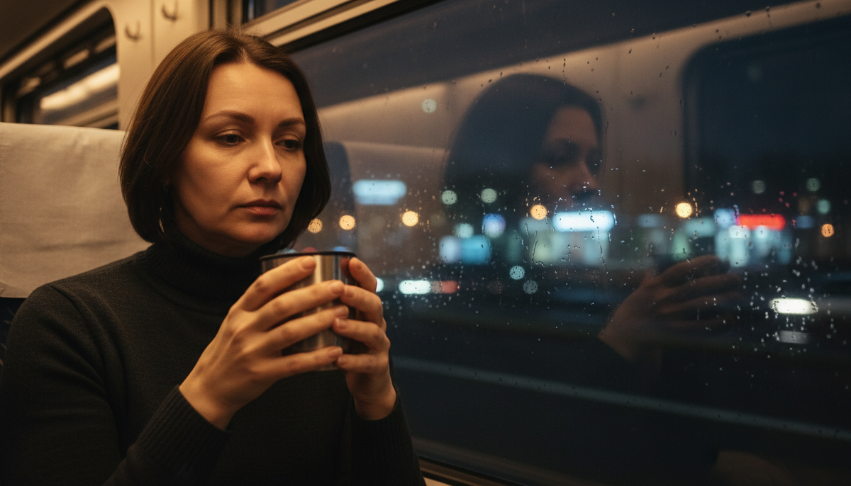 За окном поползли окраины. Промышленные корпуса с жёлтыми квадратами окон. Мокрые крыши. Одинокий светофор у переезда, красный, потом темнота, потом снова. Запах в вагоне был слоистым: нагретый воздух, чья-то еда из пакета за спиной, лёгкий запах дезинфектанта. И поверх всего, слабый запах духов соседки: сухое, чуть смолистое, совсем не громкое.