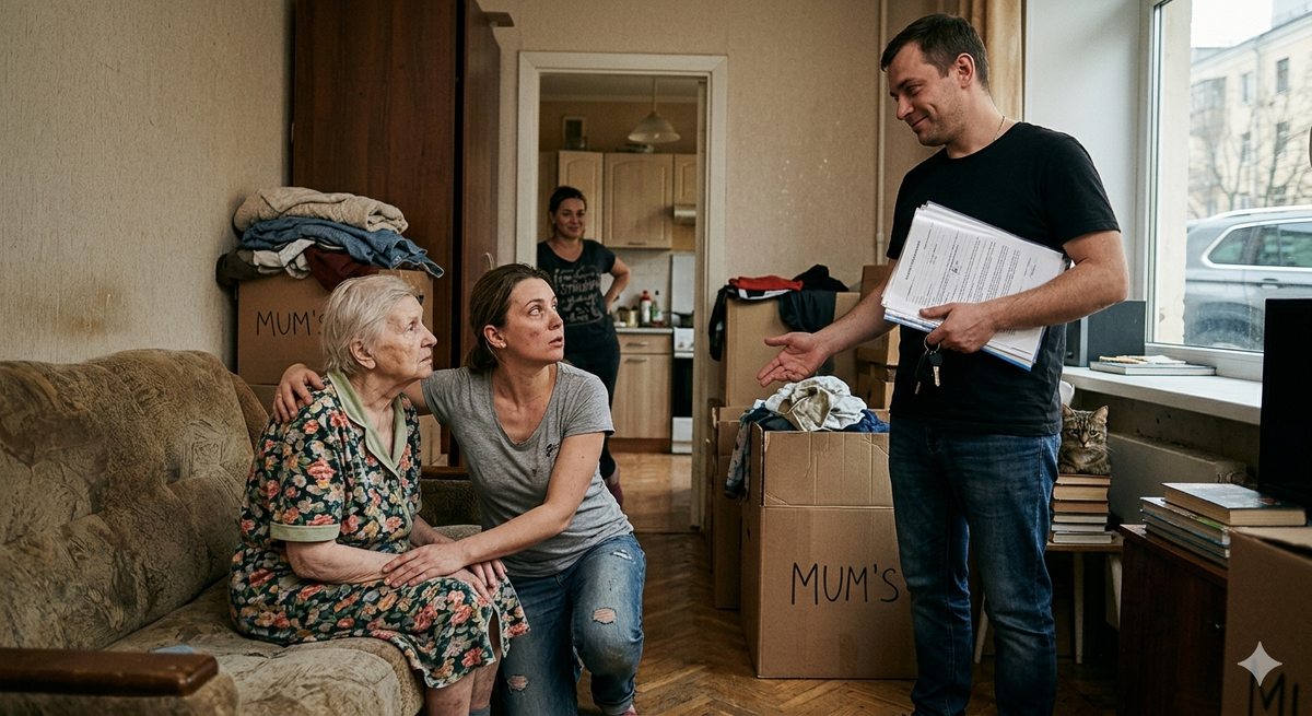 Марина зашла в квартиру, едва сдерживая слезы. В коридоре, среди горы старых узлов и баулов, сидела Анна Сергеевна. Бывшая учительница литературы, всегда безупречно причесанная, сейчас она выглядела жалко: выцветший халат, растерянный взгляд и дрожащие руки, сжимающие потертый ридикюль.