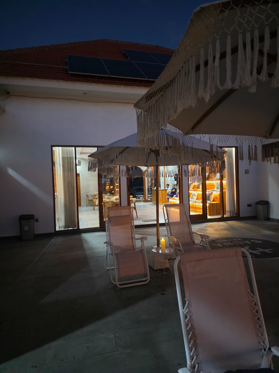Белый купол посреди бассейна. Слово SAUNA проецируется на него синим светом — крупно, уверенно. Вода отражает вечернее небо. Ловцы снов висят под навесом. Макраме, тёплая подсветка, белые лежаки, шезлонги.