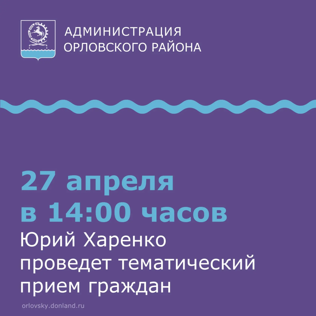 27 апреля 2026 года в 14:00 глава Орловского района Юрий Харенко проведет тематический прием граждан по социальным вопросам. Он состоится в общественной приемной Губернатора Ростовской области в Орловском районе по адресу: поселок Орловский, улица Пионерская, дом 64.
