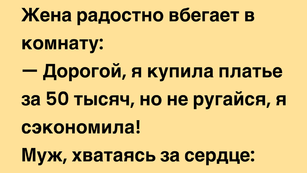 — Дорогой, я купила платье за 50 тысяч, но не ругайся, я сэкономила!