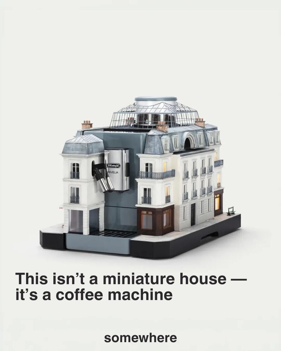 мире». Это серия сверхдетализированных фасадов кафе, установленных непосредственно на кофемашинах. Каждая модель отсылает к культовым кофейным местам, от Милана и Парижа до Токио, Копенгагена и Берлина, переводя реальную архитектуру в миниатюрную форму. Инсталляция, созданная за более чем 1500 часов с использованием технологий, применяемых в кинопроизводстве, стирает грань между объектом и окружающей средой, переосмысливая кофемашину как инструмент и место назначения. (с) somewhere.design / delonghiofficial 🤓 New Media: Telegram | MAX | Дзен