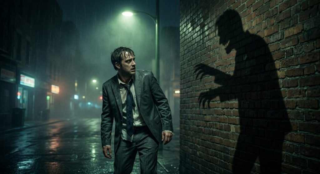 Антон тяжело дышал, прижимаясь спиной к холодной кирпичной стене. Глухой переулок пропах сыростью и гниющими листьями. Тусклый свет далекого уличного фонаря едва пробивался сквозь плотный туман, но этого хватило, чтобы Антон увидел самое страшное.