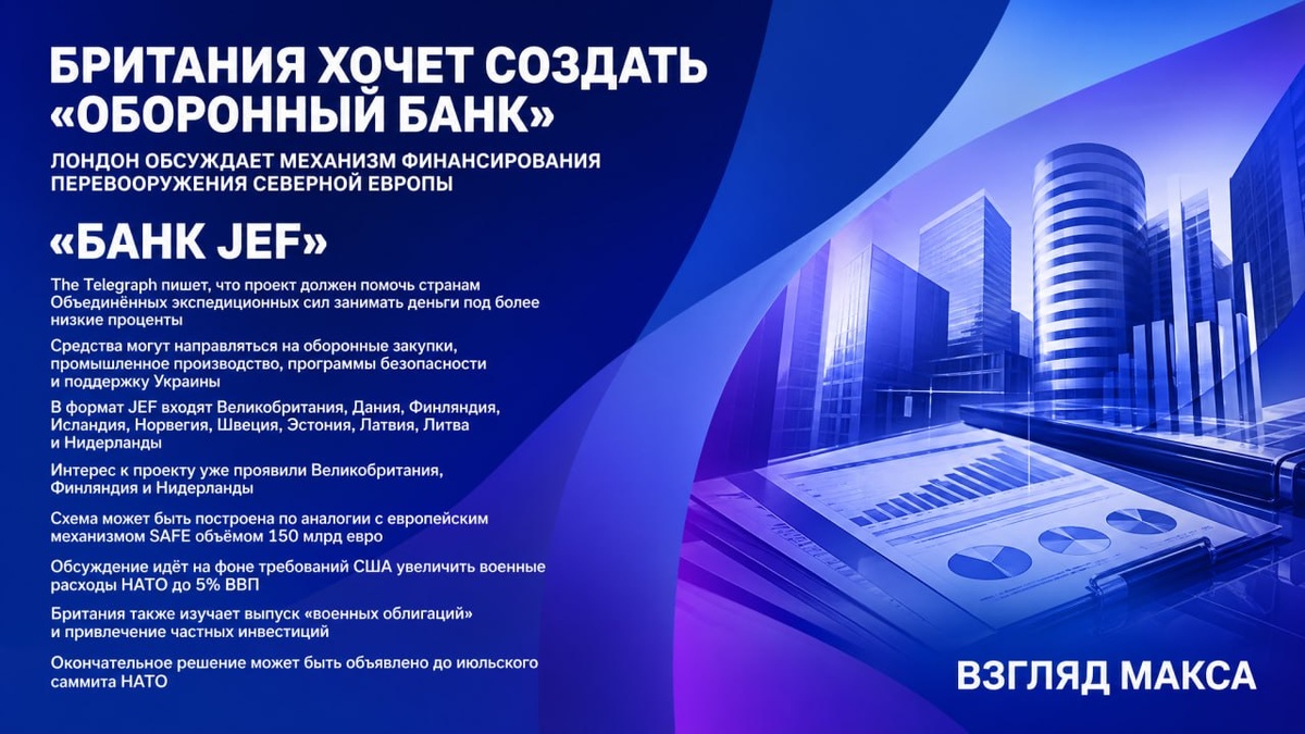 североевропейских союзников. По данным The Telegraph, речь идёт о механизме для стран Объединённых экспедиционных сил, который должен упростить совместные оборонные закупки, промышленное производство и поддержку Украины. Издание называет проект «банком JEF» — по названию Объединённых экспедиционных сил. В этот формат входят десять стран Северной Европы: Великобритания, Дания, Финляндия, Исландия, Норвегия, Швеция, Эстония, Латвия, Литва и Нидерланды. Коалиция была создана в 2015 году как инструмент быстрого реагирования на кризисы, сдерживания угроз и проведения операций прежде всего в районе Балтийского моря, Северной Атлантики и Крайнего Севера. По замыслу, новый банк позволит странам JEF занимать деньги под более низкие процентные ставки и направлять их на многонациональные оборонные проекты. Среди возможных направлений — закупка вооружений, наращивание военного производства, финансирование программ безопасности и дальнейшая передача военной помощи Украине. The Telegraph пишет, ч