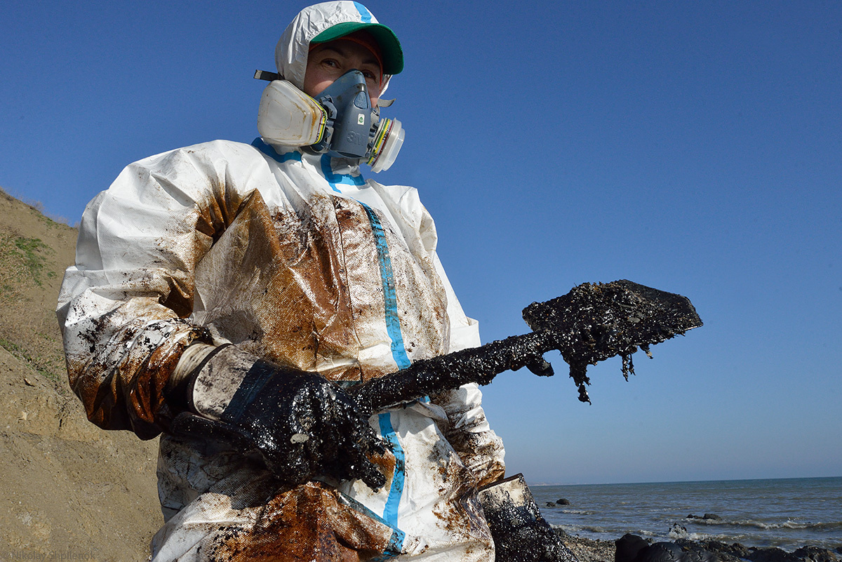 Вздыхая испарения нефтепродуктов и глядя в видоискатель камеры, я думаю: я словно присутствую на съемках масштабного фильма о конце света. Что-то ужасное случилось с нашей планетой, и люди в скафандрах убирают последствия этой катастрофы… Плотный мазут забивает лопаты, перчатки, сапоги: работать очень трудно, продвижения вперед мизерные – десятки сантиметров за час.