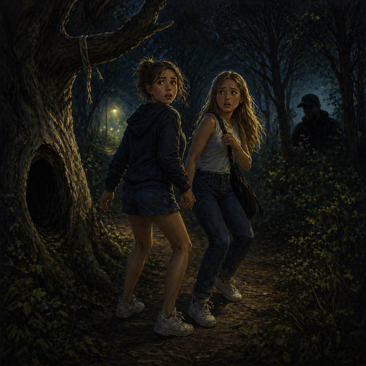 Напротив дуплистого дерева на другой стороне тропы за деревьями прятался мужчина в кепке. Из-под низко надвинутого козырька блестели в темноте его глаза. Взгляд был жесткий, пронизывающий.