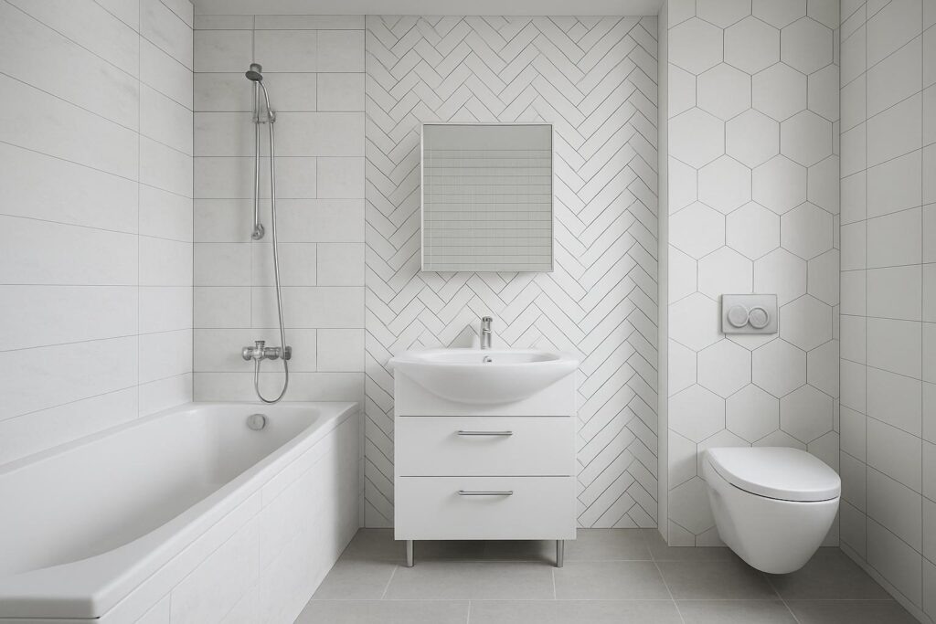 Один рисунок редко решает все задачи. Часто используют сочетания: крупный формат на основной плоскости, акцентная мозаика в нише, диагональ на полу и вертикальная полоса у душа. Такие композиции формируют структуру без перегрузки.