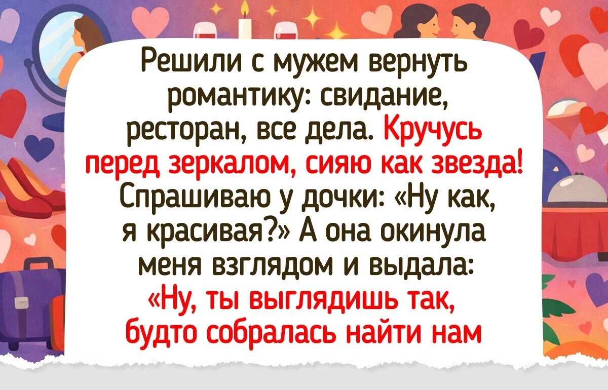 Решили с мужем вернуть романтику: свидание, ресторан, все дела. И вот я уже в новом платье на каблуках, сияю как звезда! Спрашиваю у дочки: «Ну как, я красивая?» А она окинула меня взглядом и выдала: «Ну, ты выглядишь так, будто собралась найти нам нового папу, а у нас и этот вроде еще ничего». Весь вечер муж светился от гордости, что его позиции в семье так надежно защищены главным домашним критиком. © ADME