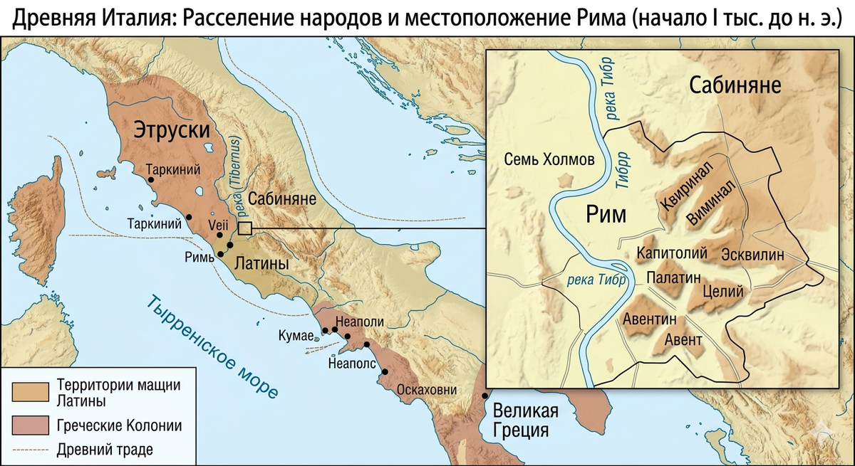 Представьте себе длинный полуостров, похожий на сапог, который глубоко вдаётся в Средиземное море. Это Италия. В древности её земли были покрыты лесами и холмами, а по долинам текли неширокие, но полноводные реки. Задолго до того, как на картах появилось слово «Рим», здесь жили разные племена: на севере – искусные строители этруски, на юге – греки, основавшие богатые колонии, а в центре – латины и сабиняне, простые земледельцы и пастухи.