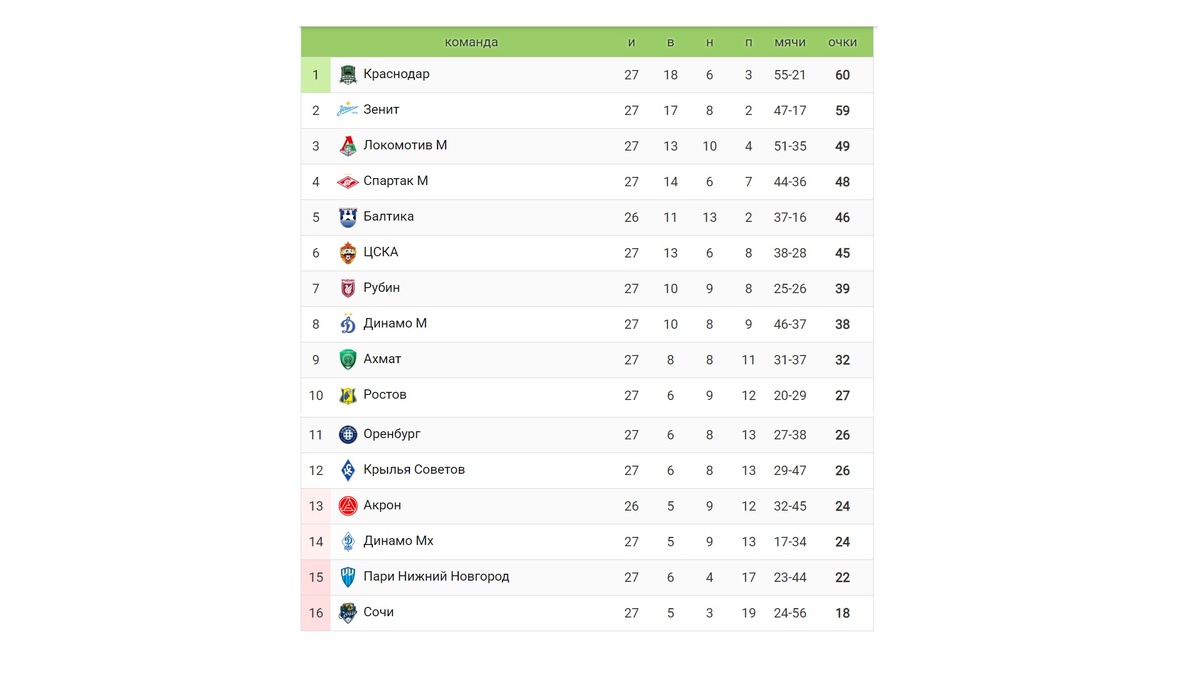 Состоялся 27 тур в российской премьер-лиге. Давайте узнаем, кто одержал победы и смог ли Зенит вернуть себе лидерство? Нижний Новгород на своём поле уступил Спартаку 1:2. За победителей отметились Барко с пенальти и Зобнин. Спартак реабилитировался за поражение от Краснодара в середине недели и вышел на 4-е место. Ростов уступил соседу по таблице Оренбургу 0:1. В концовке победный гол провёл Гузина. Эта победа позволила Оренбургу выиграть второй тур кряду и отдалится от зоны вылета. Краснодар в большинстве вырвал волевую победу у махачкалинского Динамо 2:1. Кривцов сравнял счет в этом матче, а гол Кордобы принёс три очка. Краснодар не проигрывал 10 матчей подряд, учитывая кубок России. Крылья Советов обыграли Локомотив 2:0. Олейников и Рахманович ковали эту победу. Самарцы одержали первый выигрыш в РПЛ с 8-го марта. Динамо Москва побеждает Сочи 2:0. В первом тайме отметился Тюкавин, во втором – Нгамалё. Сочинцы прерывают трёх матчевую победную серию и остаются последними в таблице. Руб
