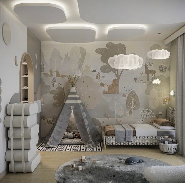 На фото представлена детская комната, которая стирает грань между реальностью и воображением. Это не просто спальня с кроваткой и шкафом — это полноценная декорация к доброй сказке, где лесные звери становятся соседями, а потолок превращается в небо. Дизайнеру удалось создать пространство, которое одновременно успокаивает (благодаря пастельной гамме) и стимулирует фантазию. Давайте разберем ключевые приемы этого волшебного интерьера и узнаем, как создать подобную атмосферу в своей квартире. Первое, что притягивает взгляд — это потолок. Это не просто белая плита, а сложная многоуровневая конструкция. Акцентная стена с фотообоями (или росписью) задает тон всему интерьеру. В комнате четко выделены зоны, каждая из которых важна для развития: Мебель в этой комнате подобрана с учетом возрастных особенностей: Эта детская комната — пример того, как дизайн может служить развитию ребенка. Здесь продумано все: от безопасности мебели до сюжетов на стенах, которые учат любить природу. Это пространс