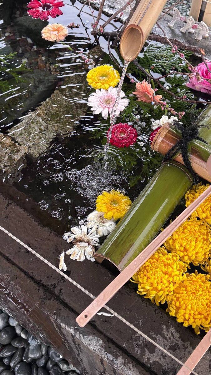 Это 手水鉢(ちょうずばち). Вода символически очищает тело и душу перед тем, как человек войдет в священное пространство⛩️ Во время пандемии COVID многие святилища и храмы приостановили использование 手水, чтобы предотвратить распространение инфекции. Чаши начали заполнять сезонными цветами 🌼 Так стала популярной традиция 花手水 (はなちょうず, досл. «цветочная вода для рук») Сегодня такие композиции - просто объект для созерцания, создающий ощущение умиротворения 🤩